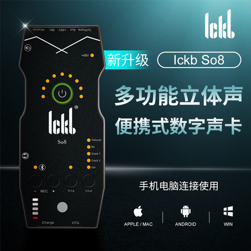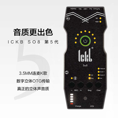 ickb SO8 5代聲卡是網紅、直播主公認的高品質手機直播聲卡,主打 Hall 演唱級混響、多核 DSP 處理、動態降噪、動態增益、特效音量可調等多項升級。支援 OTG 無損伴奏、藍牙無線伴奏、48V 幻象電源,可直推大多數電容麥克風。SO8 5代內建 9 種場景音效,附遙控器操作方便,電池容量大,適合長時間直播。產品設計便攜、音質細膩,適合進階直播主與歌唱愛好者。