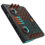 可使用動圈式咪和任何電容咪使用!超輕型金屬外殼,Led圍邊燈光效果,超時尚調節滾輪或音量,led顯示大小音量,可外接有源音箱 雙手機直播或雙手機錄音,支援藍牙無線伴奏,約5小時電量特長使用時間。