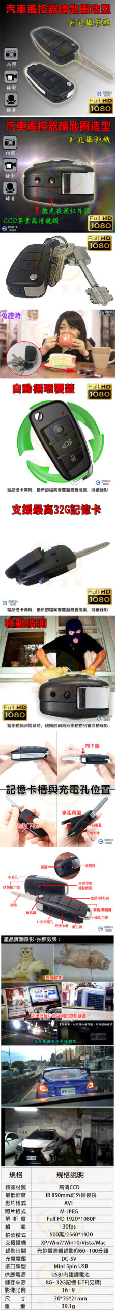 高清1080P針孔攝錄影機 仿真偽裝車鑰匙遙控器 DV密錄器 鑰匙圈扣環監視器 攝錄鏡頭 錄影音同步 支援記憶卡/錄音筆/拍照蒐證