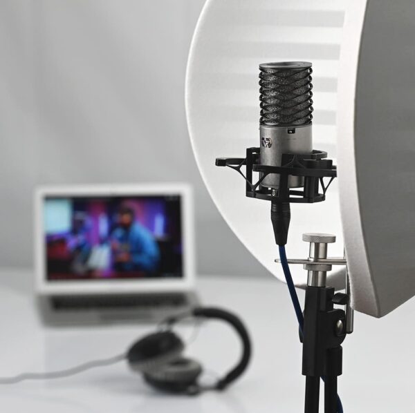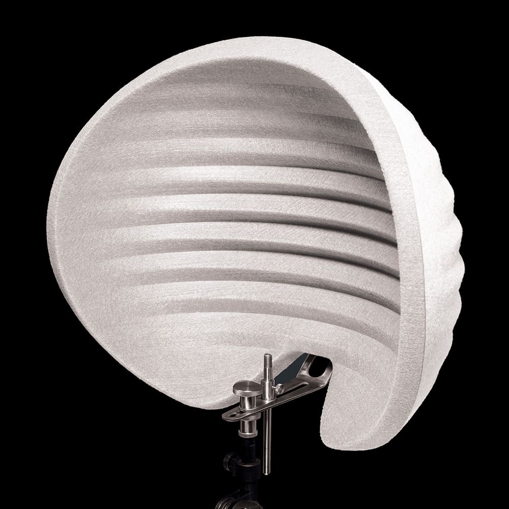 Aston Microphones Halo Ghost反射濾鏡很大,白色。而且效果非常好。原因如下:獨特的專利殼形設計環繞麥克風的頂部、底部和側面,最大限度地隔離室內聲音。 Halo 的紋理波形表面也有助於擴散直達聲音。它採用 PET 毛氈製成,市面上挑戰最高效、最輕質的聲學材料之一。
