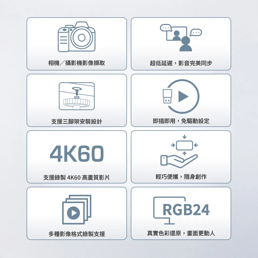 - 採用無壓縮RGB24色彩格式/支援最高4K60與1080p240高畫質擷取