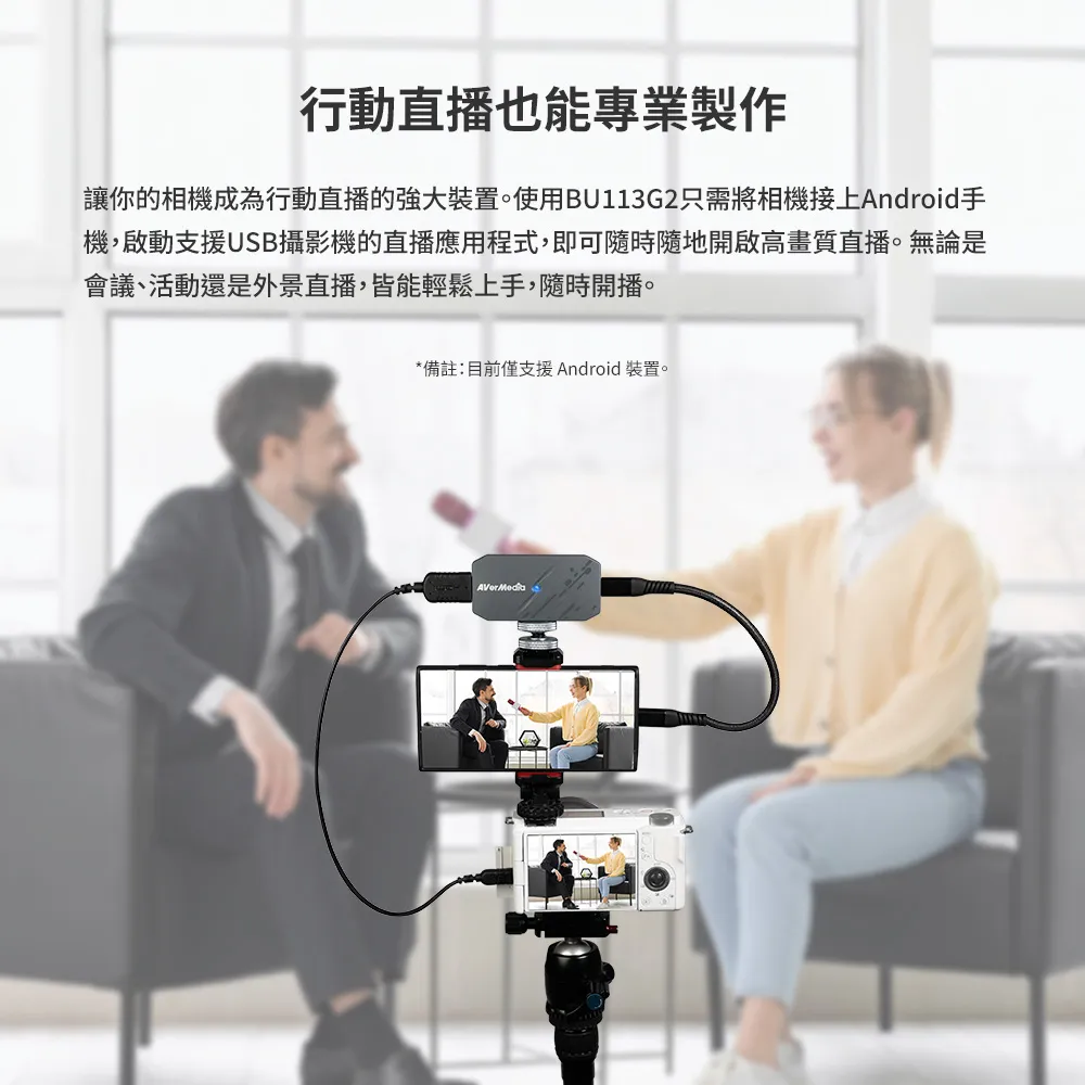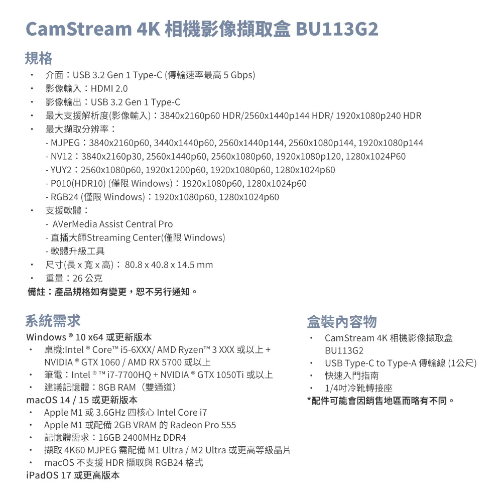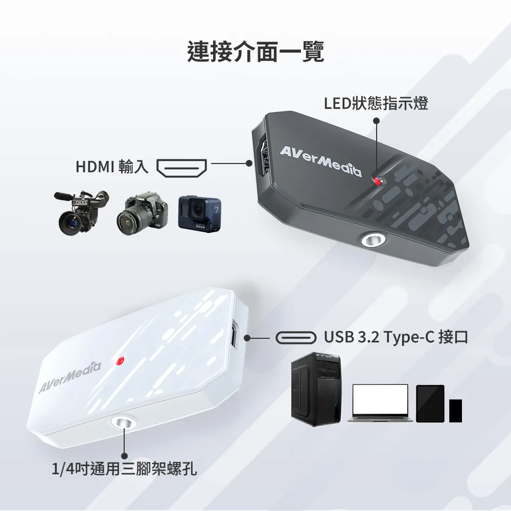 AverMedia 圓剛BU113G2 CamStream 4K高畫質相機影像擷取盒(HDMI 2.0/USB 3.2/GEN 1/Type-C) 黑/白2色