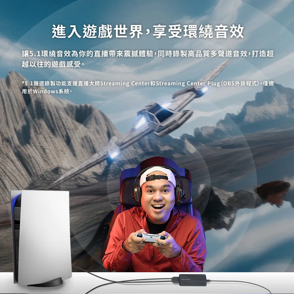 ● 支援直播大師Streaming Center軟體,解鎖「VRR 錄製」和「 5.1 多聲道音效擷取」等進階功能(僅適用於Windows系統)