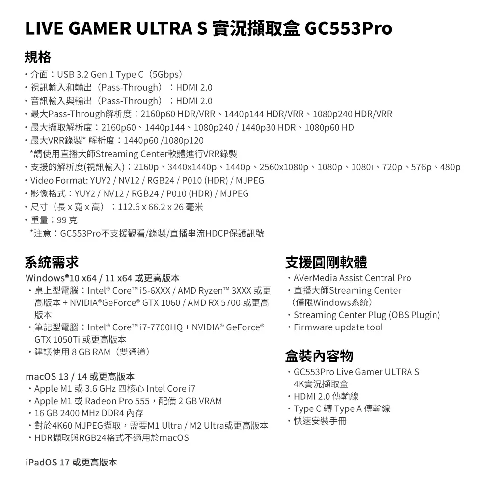 AverMedia 圓剛GC553 Pro Live Gamer ULTRA S 4K實況擷取盒黑/白2色