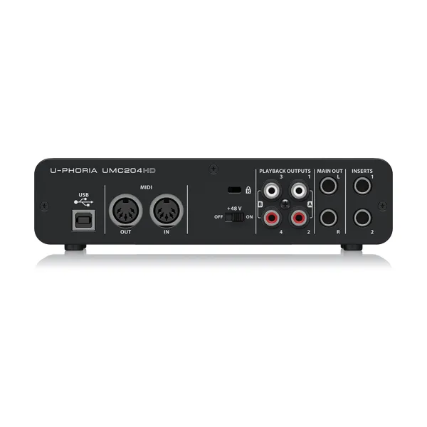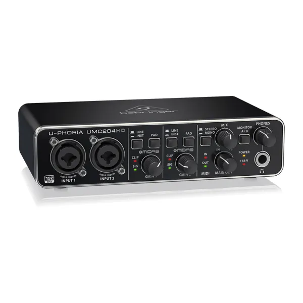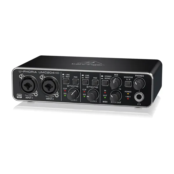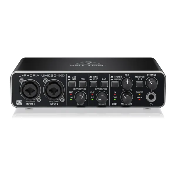 這台UMC204HD,使用最經典,音質超優低雜訊的MIDAS麥克風放大電路,有兩個XLR與TRS平衡式 Combo式輸入,可直接連接麥克風和樂器,各自獨立音軌的Gain及輸出音量,耳機音量的控制旋鈕,也有+48V幻象電源供應,還有Direct Monitor零延遲監聽選擇,是一台功能齊全,操作簡便高品質的錄音介面。