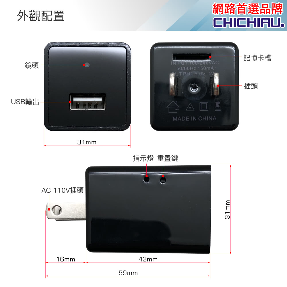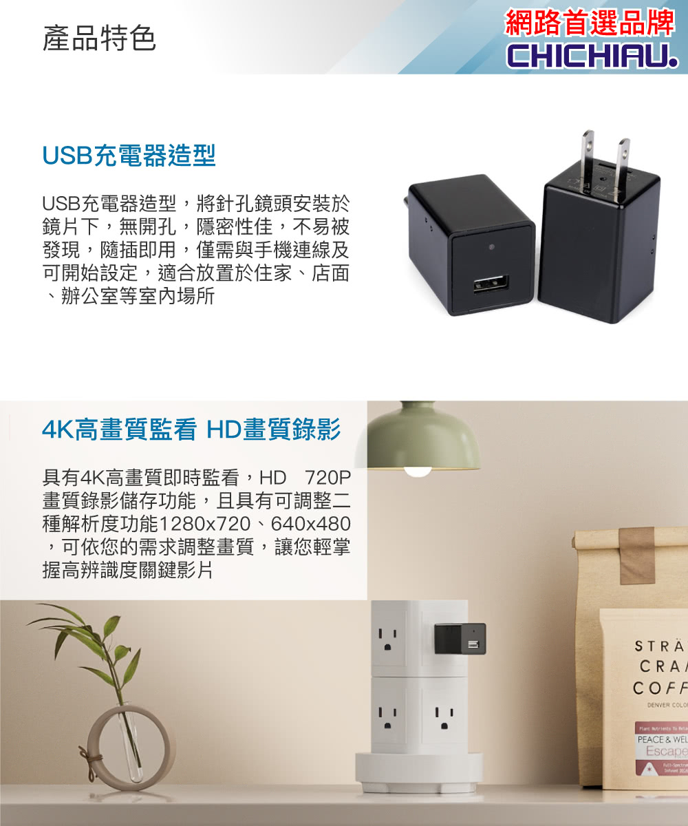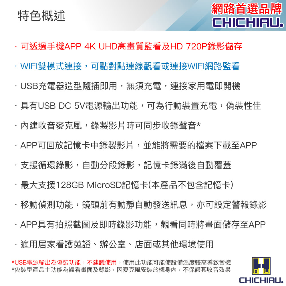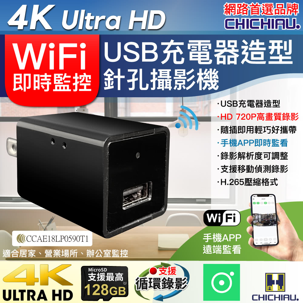 【CHICHIAU】WIFI 4K USB充電器造型無線網路微型針孔攝影機WM1,有別一般同類產品,傳送圖像速率高免除畫面不連續中斷之困擾,為本公司嚴選4K 高顯彩微型(針孔)攝影機,支援WIFI 手機點對點連線及WIFI遠端連線在免費提供下載手機APP上觀看、操作設定、錄影回放、移動偵測錄影之功能(相關產品附屬功能會因手機、版本、網路訊號、APP等眾多因素導致延遲或無法使用),錄影可設定存檔記憶卡錄滿會自動循換覆蓋掉最早的影像檔案,本商品沒有內置鋰電池儲電功能,無法充電後使用,需連接110V電源插座上持續供電可達到長時間錄影畫面,可無聲無息的側錄整個影音畫面,並儲存於外插最大支援128GB記憶體中,方便記錄特殊工作或私密偵蒐之超級利器。