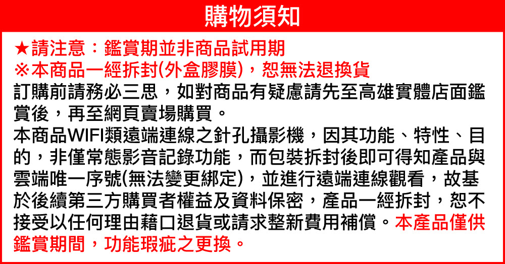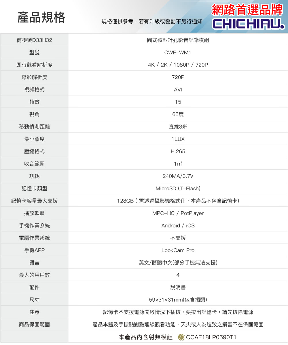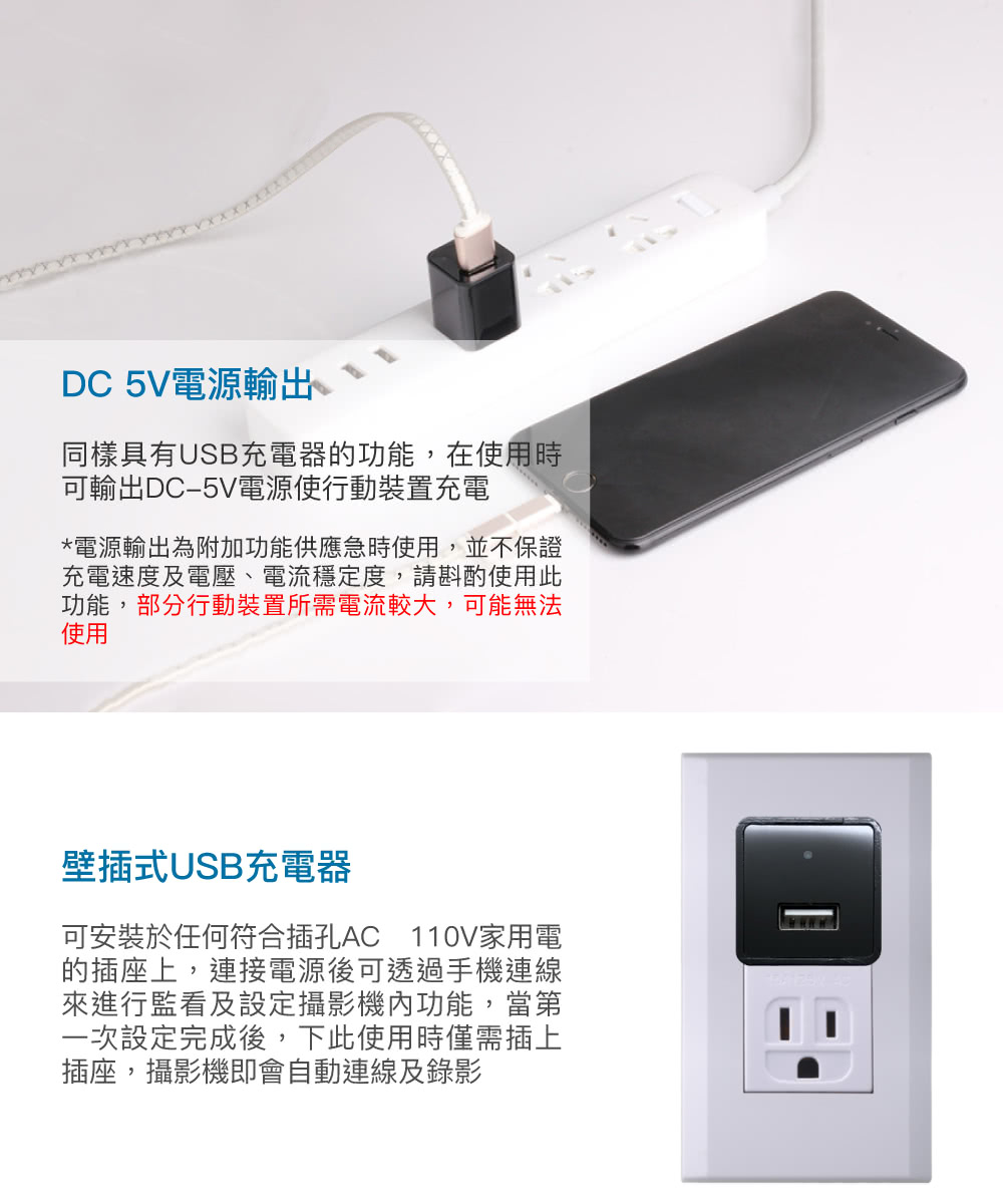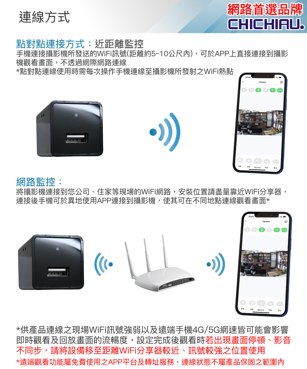 【CHICHIAU】WIFI 4K USB充電器造型無線網路微型針孔攝影機WM1,有別一般同類產品,傳送圖像速率高免除畫面不連續中斷之困擾,為本公司嚴選4K 高顯彩微型(針孔)攝影機,支援WIFI 手機點對點連線及WIFI遠端連線在免費提供下載手機APP上觀看、操作設定、錄影回放、移動偵測錄影之功能(相關產品附屬功能會因手機、版本、網路訊號、APP等眾多因素導致延遲或無法使用),錄影可設定存檔記憶卡錄滿會自動循換覆蓋掉最早的影像檔案,本商品沒有內置鋰電池儲電功能,無法充電後使用,需連接110V電源插座上持續供電可達到長時間錄影畫面,可無聲無息的側錄整個影音畫面,並儲存於外插最大支援128GB記憶體中,方便記錄特殊工作或私密偵蒐之超級利器。