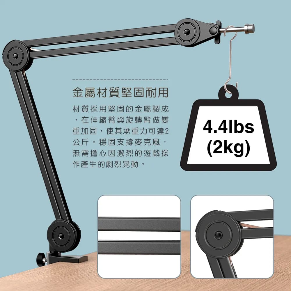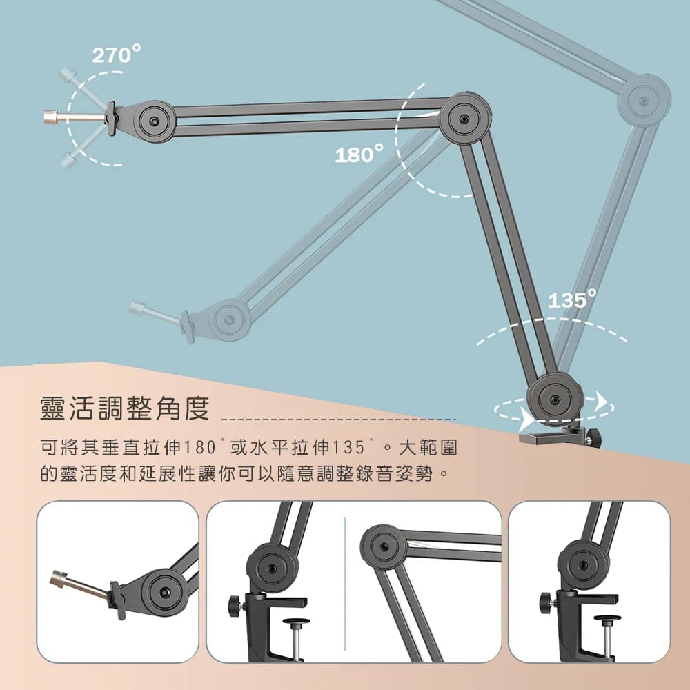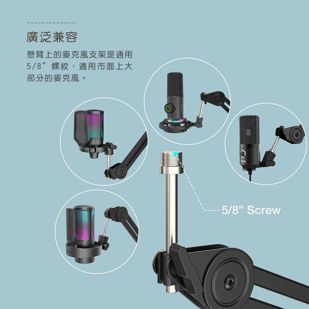懸臂上的麥克風支架採通用5/8”螺紋,適用市面上大部分的麥克風。
