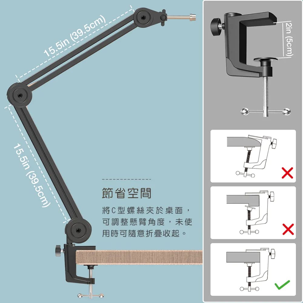 將C型螺絲夾於桌面,可調整懸臂角度,未使用時可隨意折疊收起。