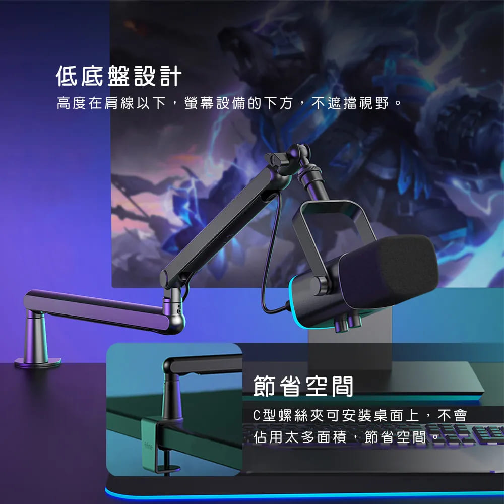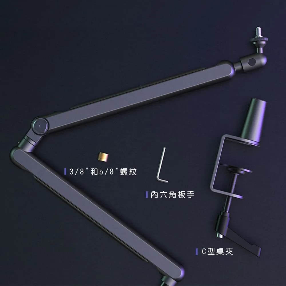 懸臂上的麥克風支架通用3/8″和5/8″螺紋,適用市面上大部分的麥克風。