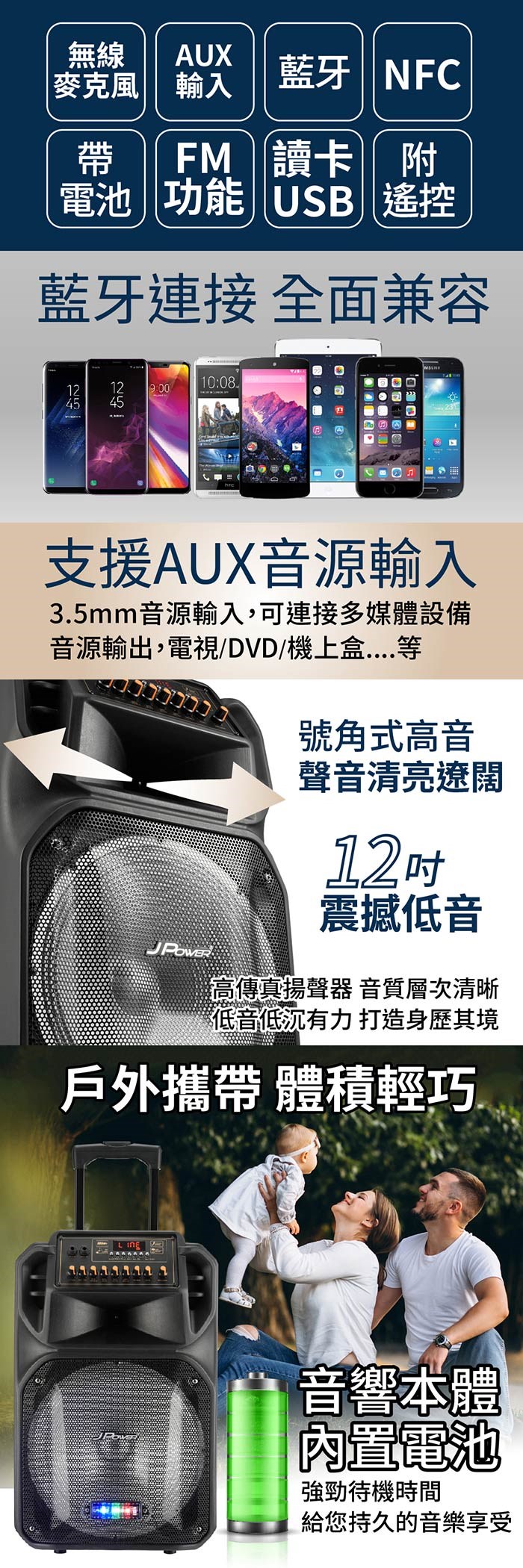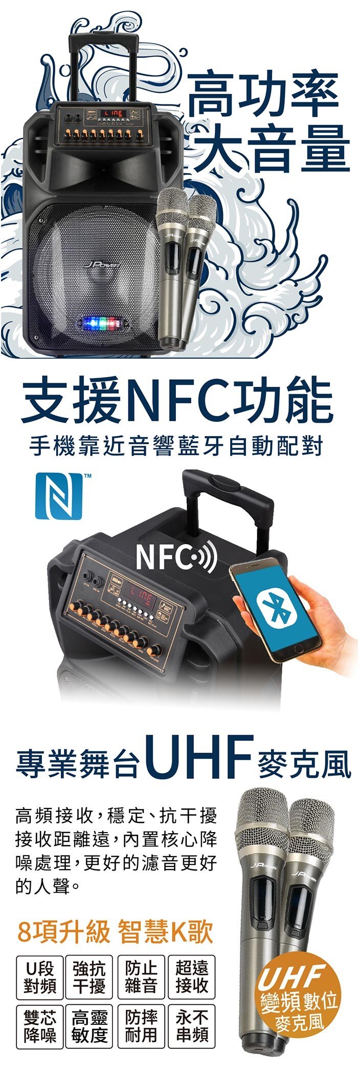 - 功能/規格:無線麥克風、AUX輸入、藍牙、NFC、帶電池、FM功能、讀卡USB、附遙控