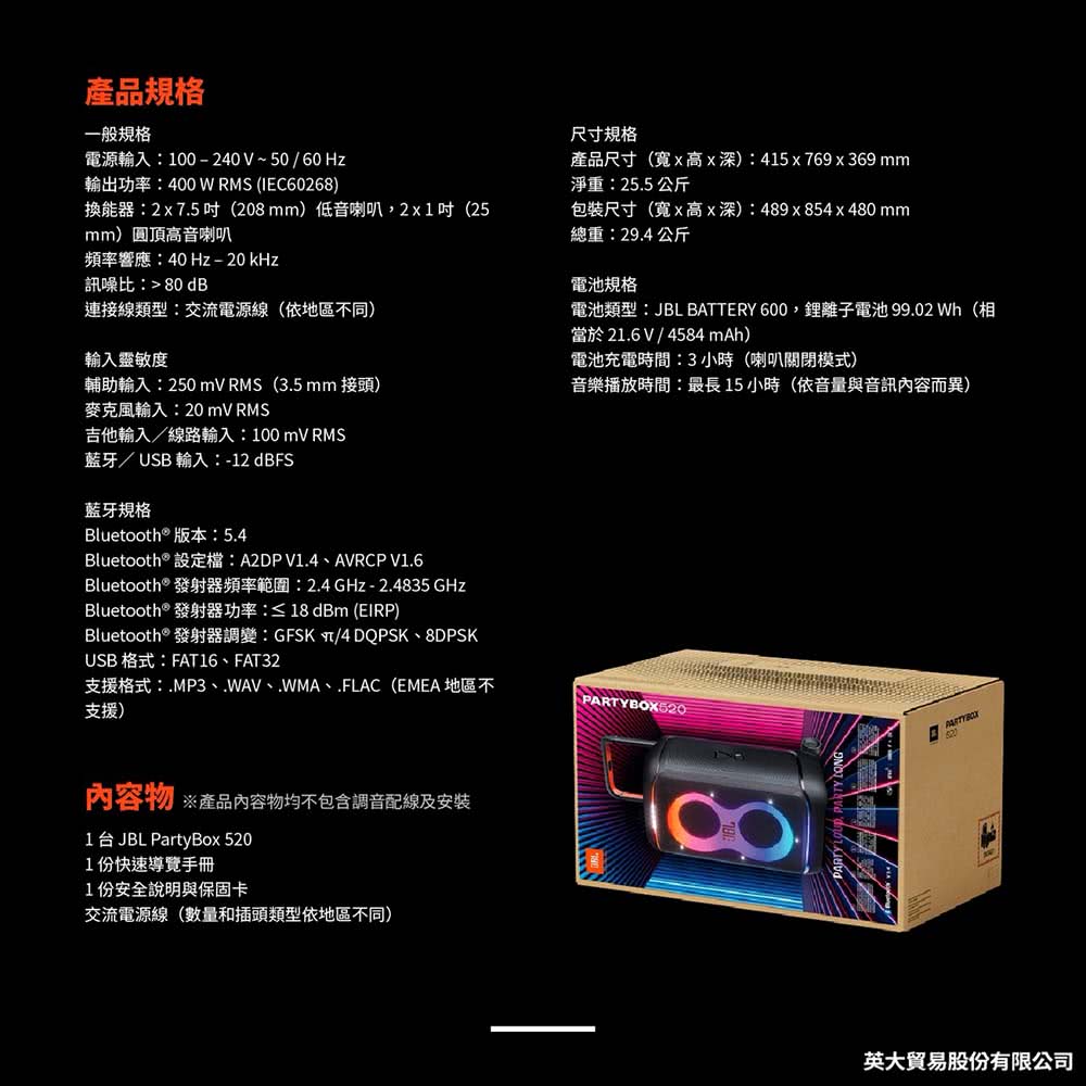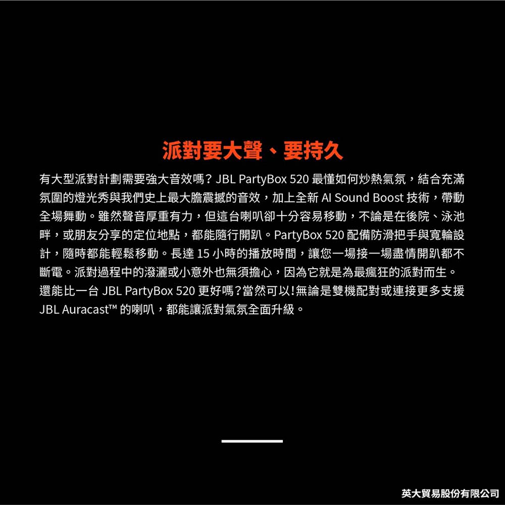 JBL 便攜式派對藍牙喇叭(PARTYBOX 520)