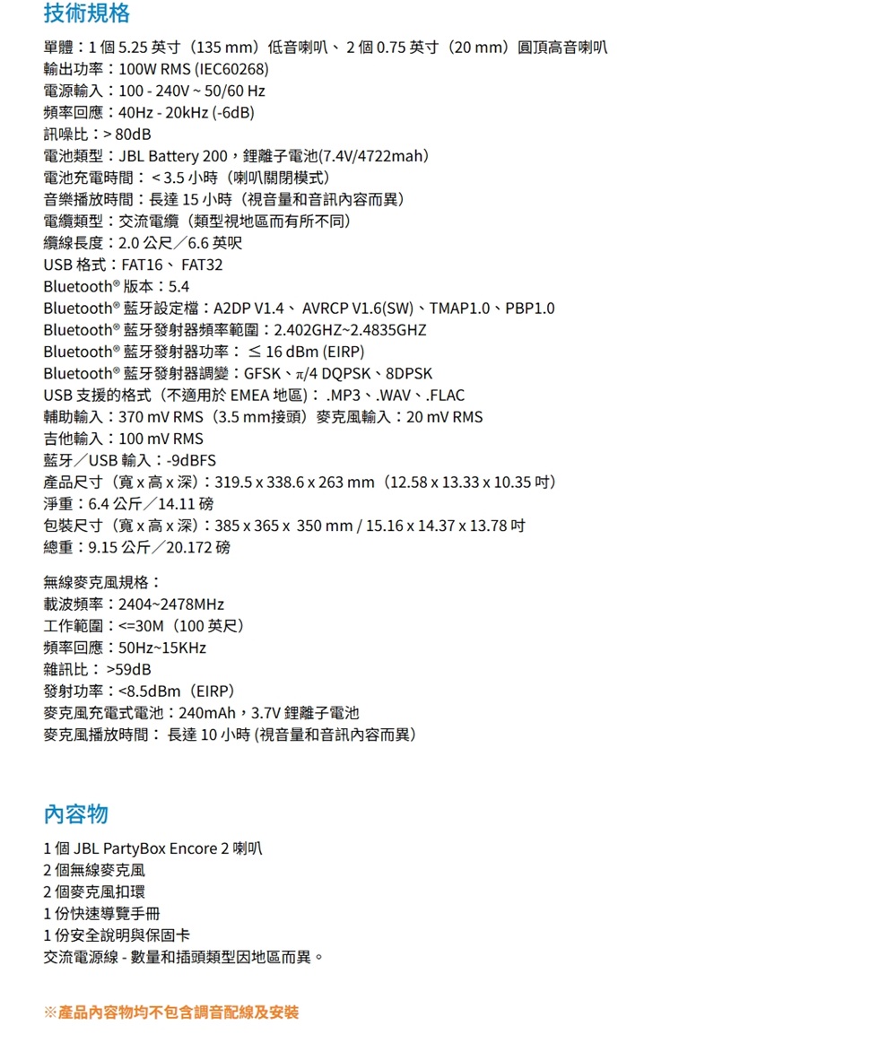 JBL 英大 Partybox Encore 2 手提式派對藍牙喇叭(內附2支無線麥克風) 數量