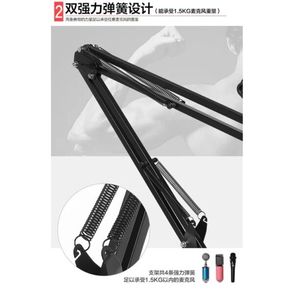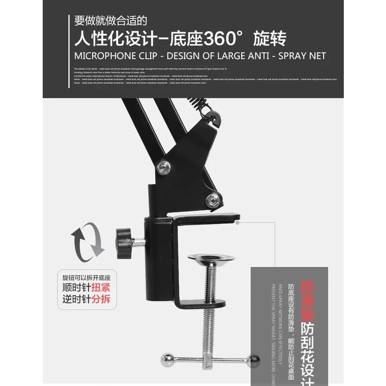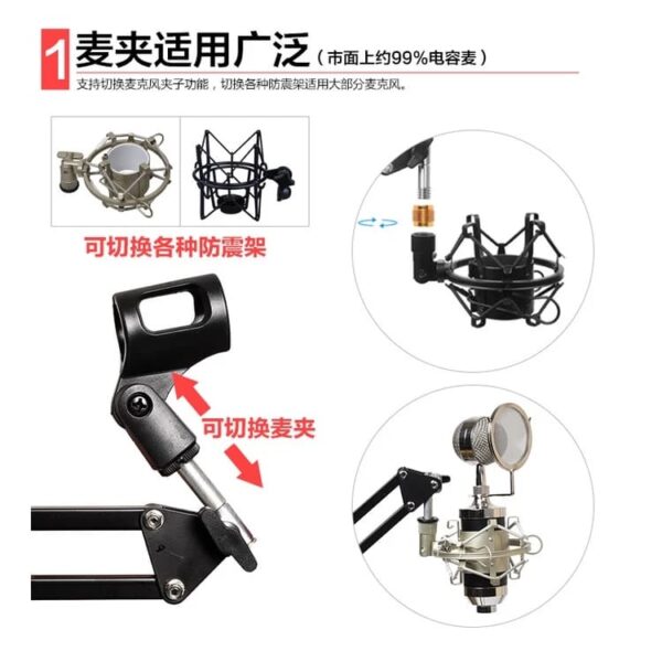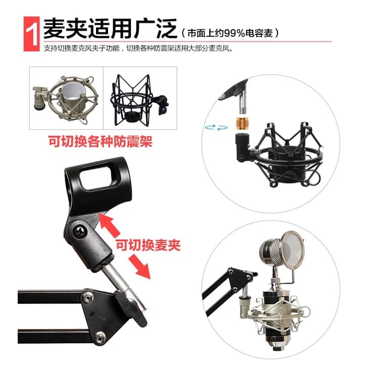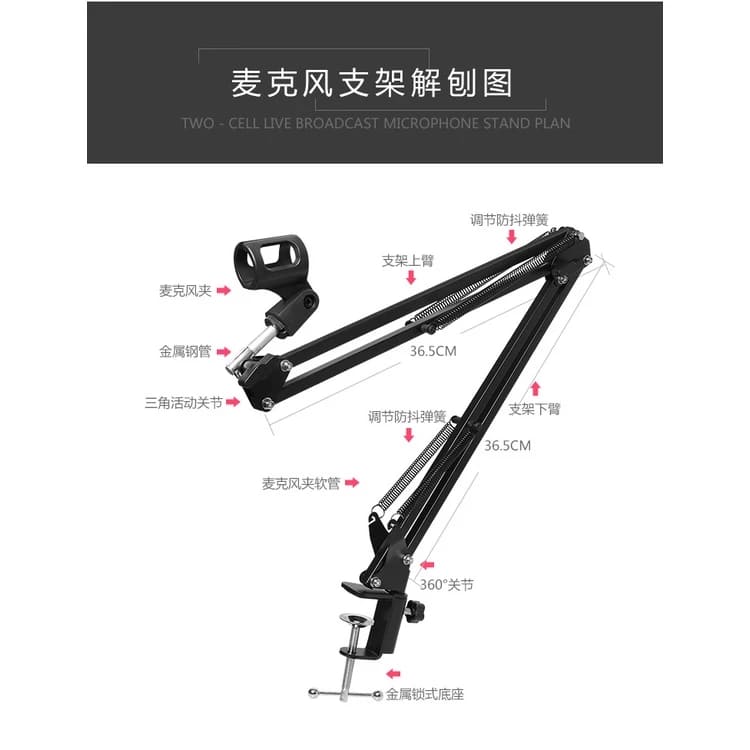 產品內容:懸臂長約35cm+35cm,支架接頭3/8吋,內附的麥克風套夾適合直徑3公分以內的動圈麥克風,如果比較粗的麥克風,建議加購防震架或是特大彈簧夾