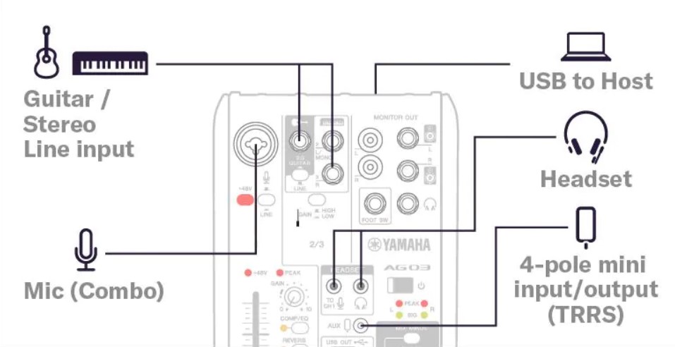 AG06 MKII 允許您連接兩個您所選的電容式麥克風,以及兩個樂器的立體聲線路輸入,還有一個更高階的四極 TRRS 接口 (可供連接耳機麥克風組合型),提供智慧型手機輸入和輸出的能力。